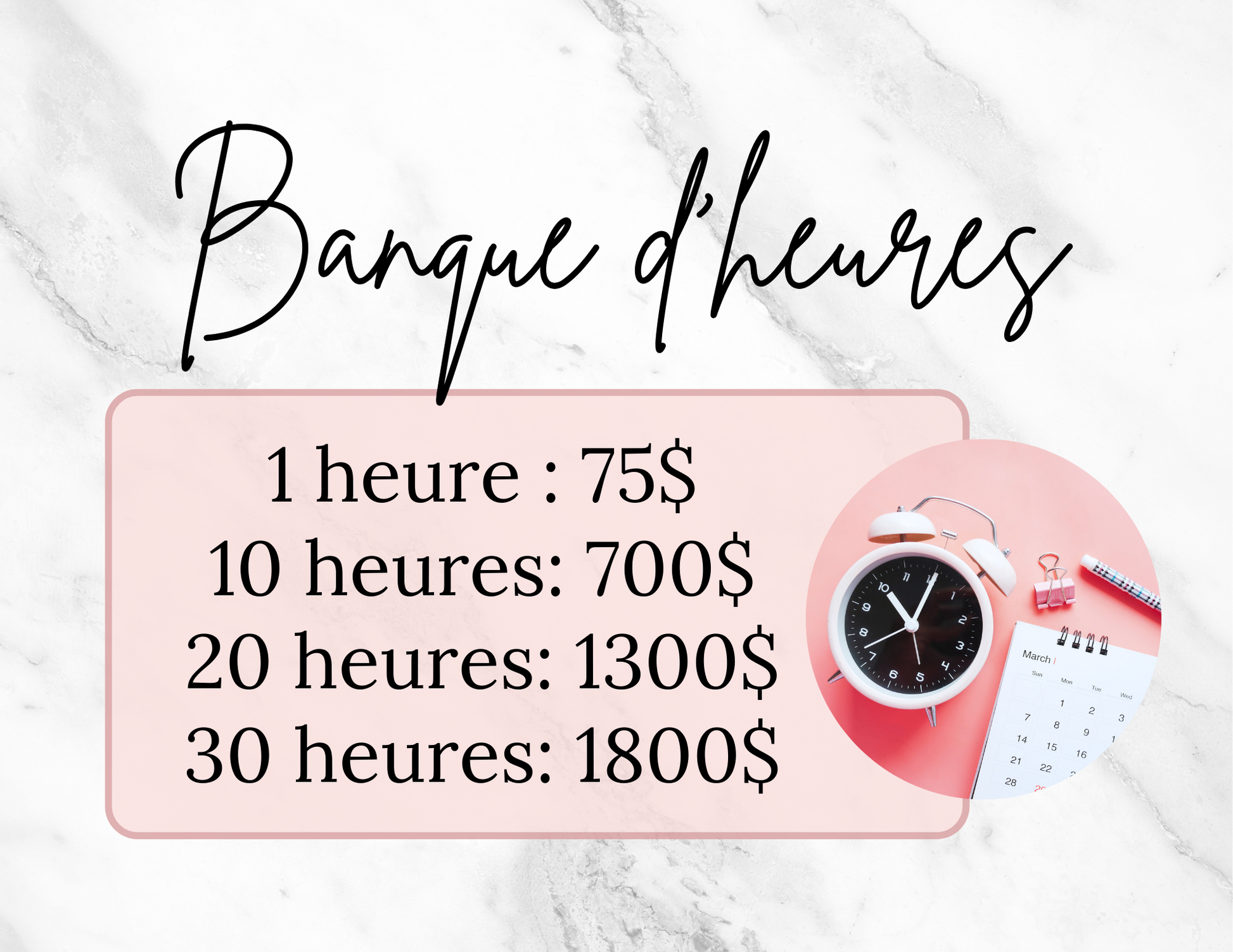 ***Un pré-avis MINIMAL de 48h est demandé pour utiliser votre banque d'heures afin de pouvoir prévoir mon horaire pour vous offrir un service de qualité ! Il est possible de prendre rendez-vous pour vos heures via l'onglet Disponibilités.