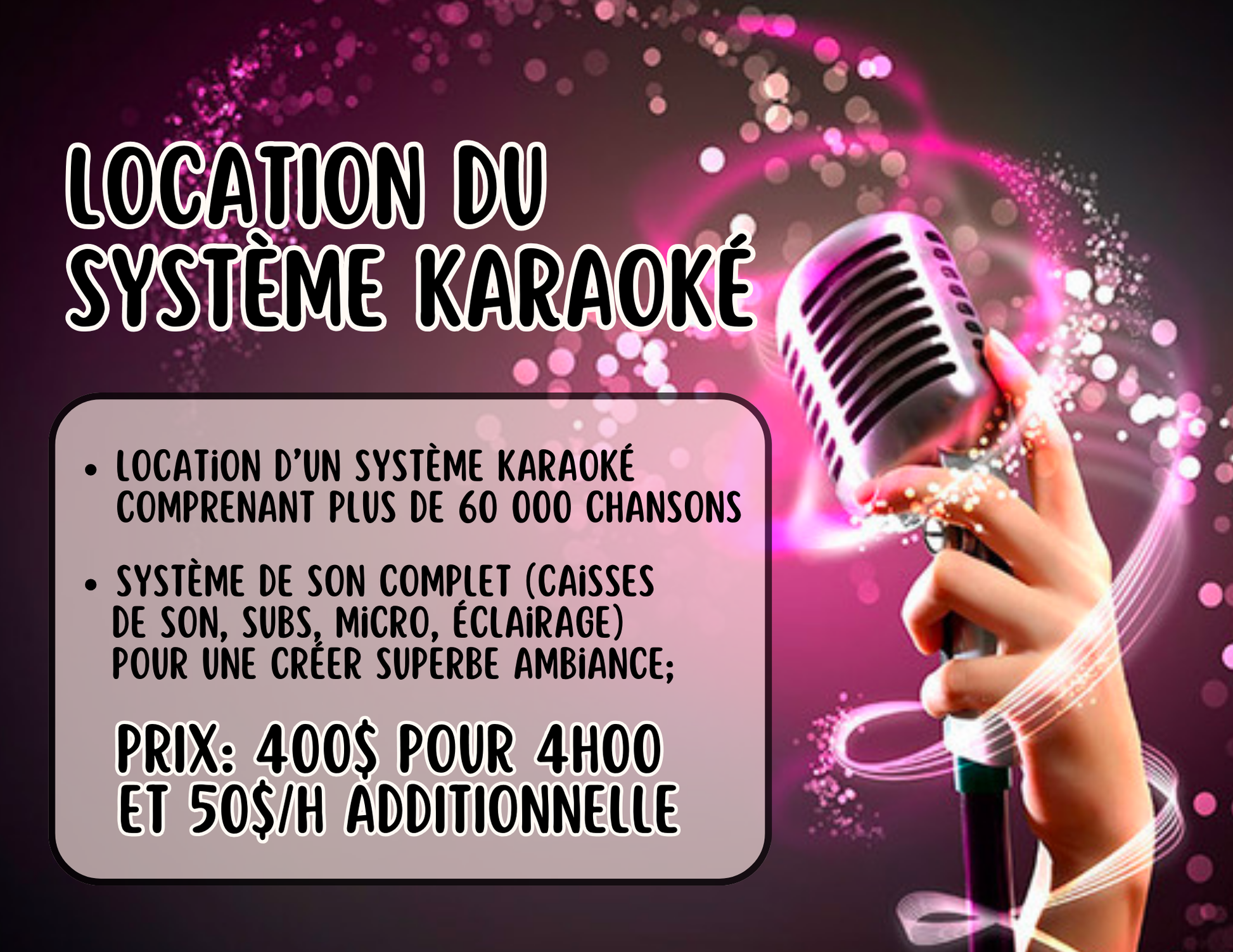 - Un système de karaoké comprenant plus de 60 000 chansons ;
